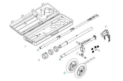 E- телескопическая ось; F- зубцы; G- набор зажимов; H-наплечный ремень; I- футляр.